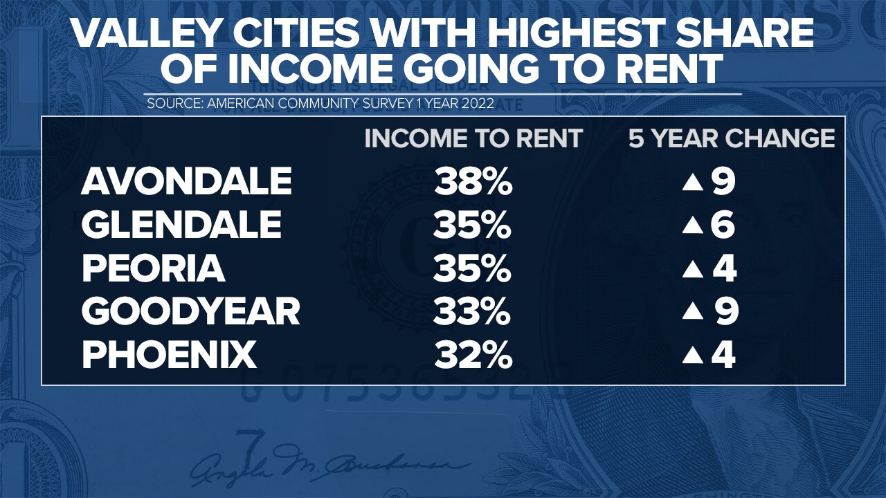 Valley cities where rent accounted for the largest share of household incomes are in the West Valley. Avondale tops the list at 38% and a nine-point increase in five years. Glendale, Peoria, Goodyear, and Phoenix are also in the top five.