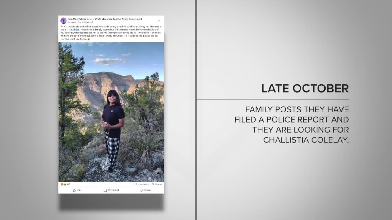 "The BIA Fort Apache Agency and the White Mountain Apache Tribal Police are continuing to investigate this case to bring closure to Challistia Colelay's family and community and justice to those responsible," the statement read in part. "At this time, we do not have any additional information to share."
