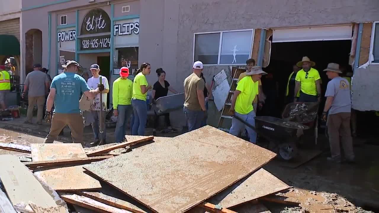 The flooding, which began late Friday, caused widespread damage and shut down portions of US 60 overnight and into Saturday morning. Water swept through the downtown area, submerging streets and sending vehicles and propane tanks floating through the city.