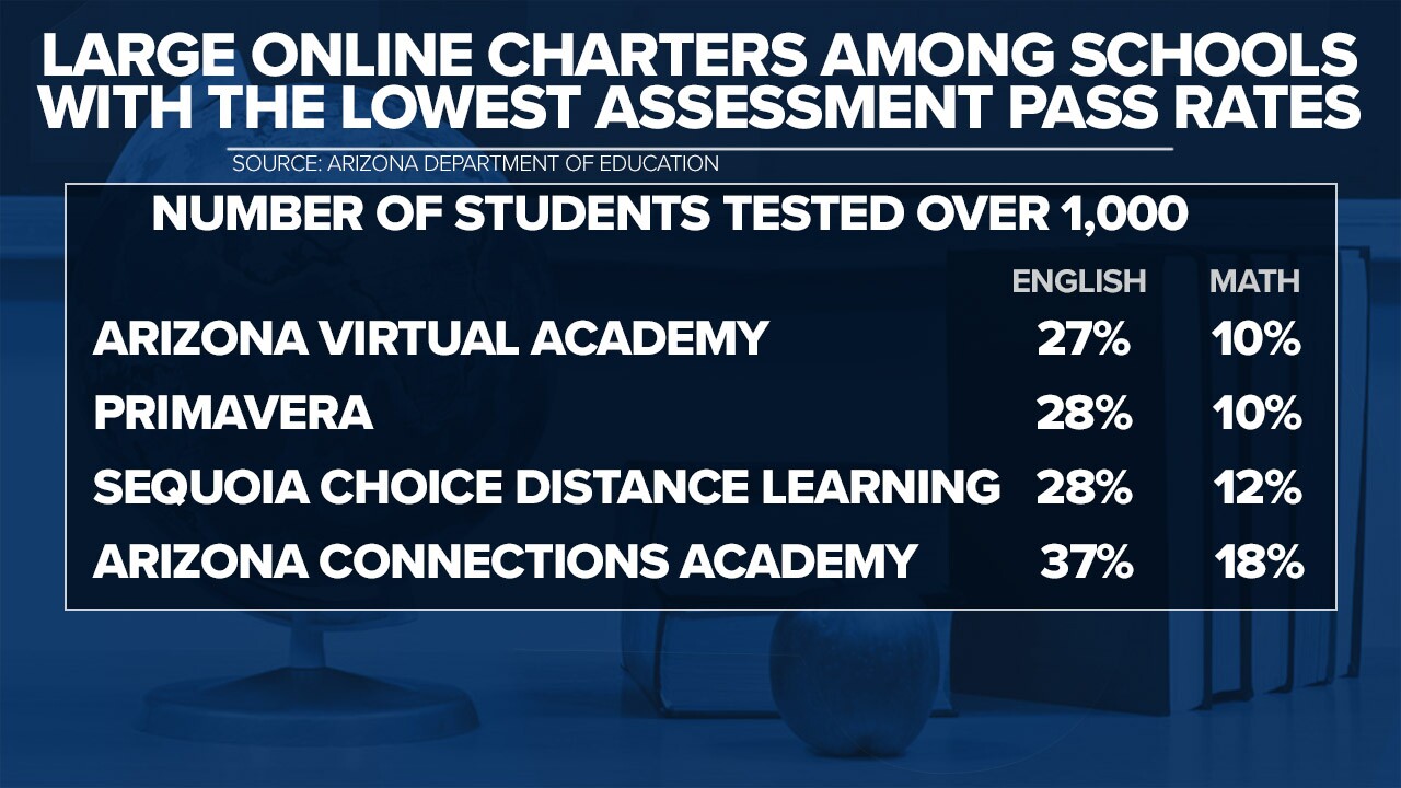 A major outlier for charter schools was four large online schools, Arizona Virtual Academy, Primavera, Sequoia Choice Distance Learning, and Arizona Connections Academy. These schools collectively tested more than 7,000 students had had some of the lowest assessment pass ratings in the state.