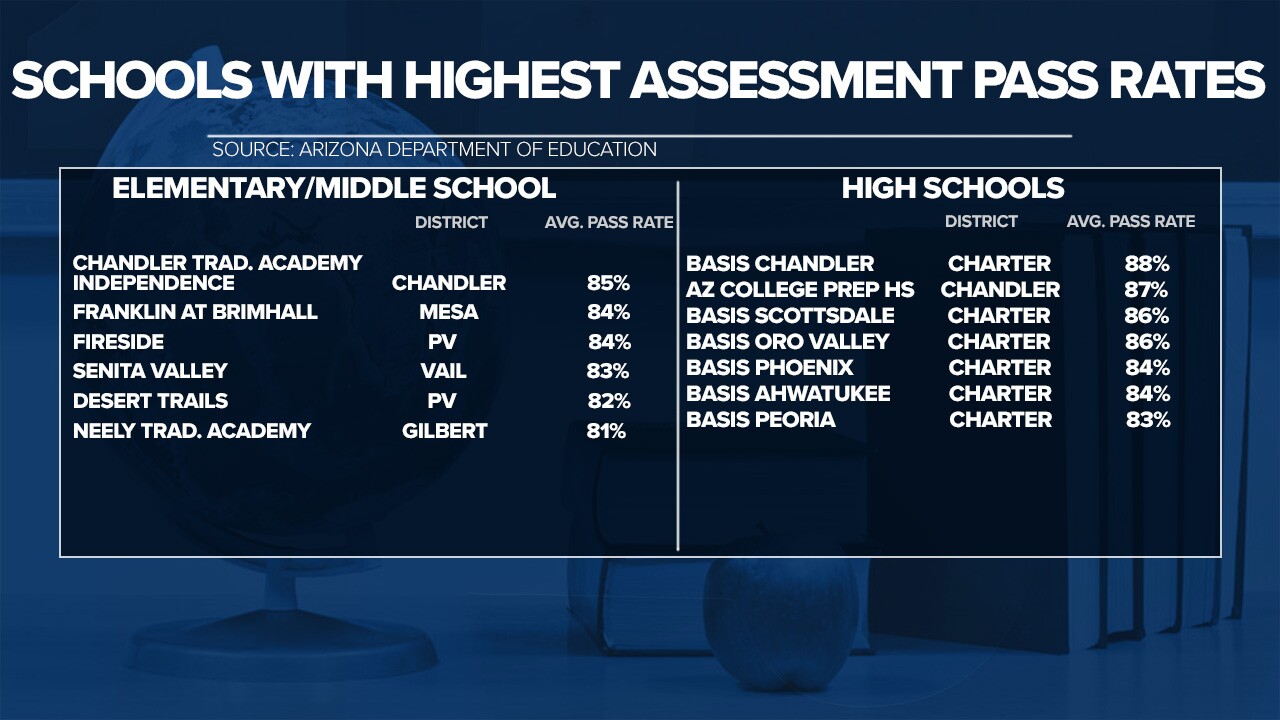 The list of high schools with the top combined average pass rating is dominated by BASIS charter schools. BASIS Chandler was ranked number one with an average of 88% of passing Math and ELA. Arizona College Preparatory High School in Chandler came in second at 87% in Math and is the only district high school to rate above 80%.