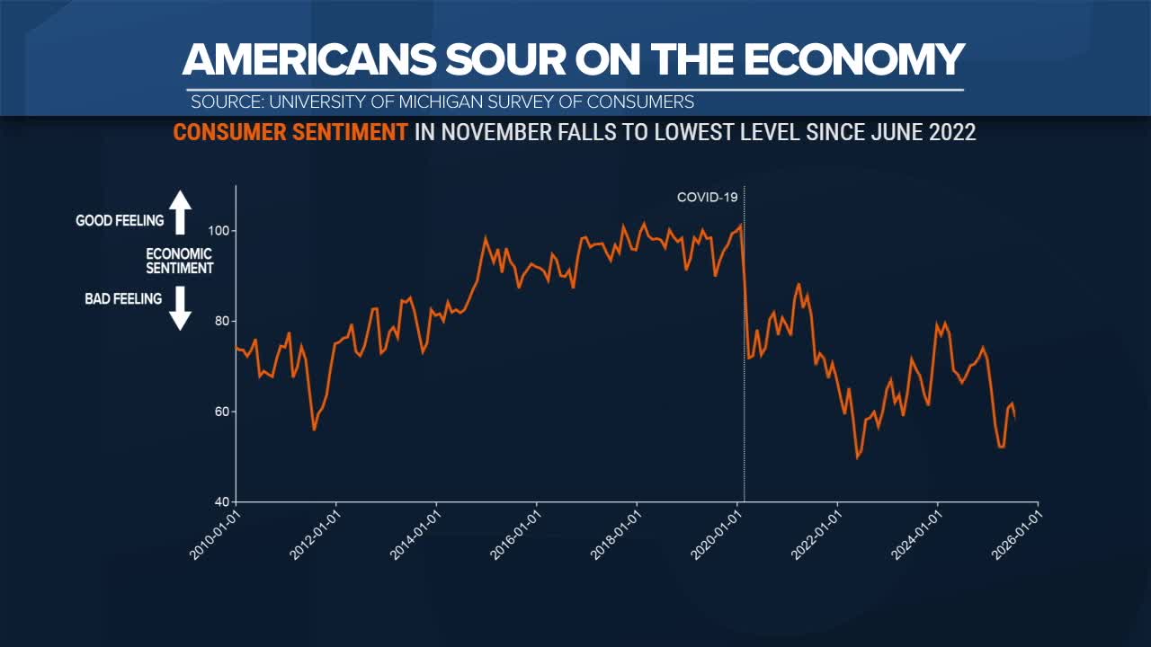 The record-breaking government shutdown has left Americans feeling worse about the economic outlook. That’s according to the latest University of Michigan consumer sentiment survey, which showed the index falling to 50.3 this month from 53.6 in October.