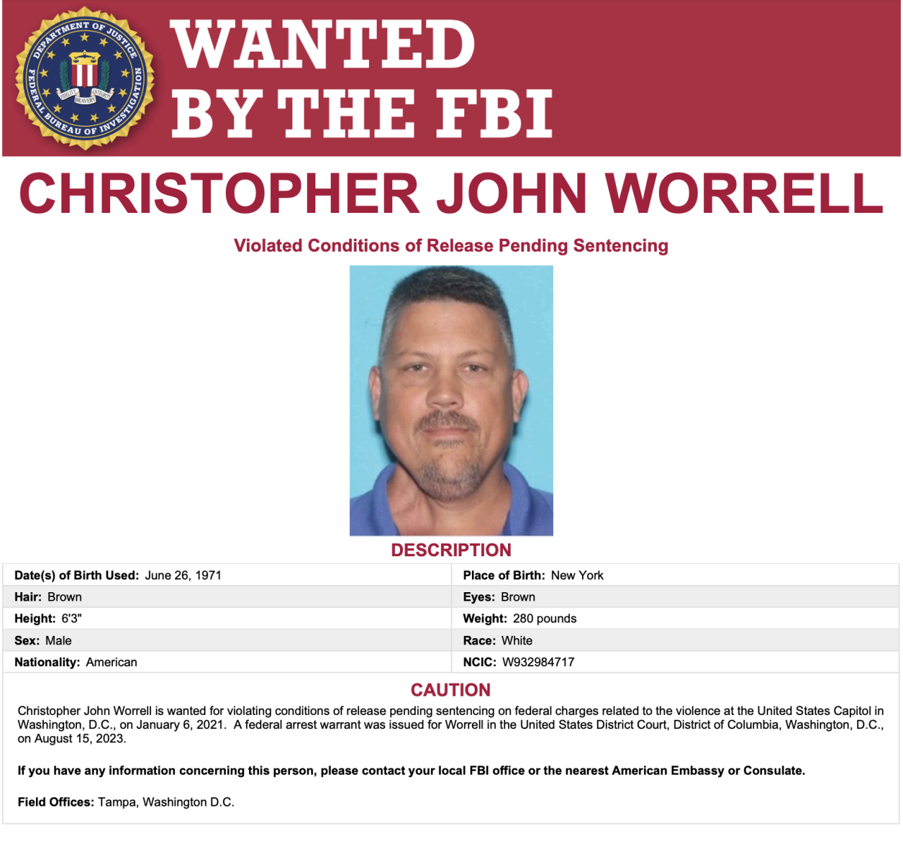 The FBI hasn't updated the public on the search for Worrell since last week. The FBI issued a warrant for violated conditions of release pending sentencing.