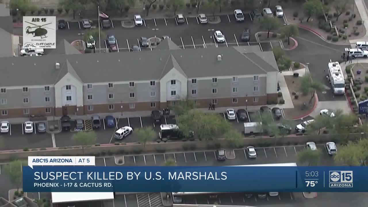 PHOENIX, AZ — Multiple law enforcement agencies, including the Federal Bureau of Investigation (FBI), the US Marshals Service, and Phoenix Police were spotted outside a hotel in north Phoenix Friday after the US Marshals Service were involved in a shooting, according to Phoenix Police.