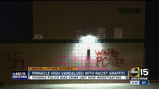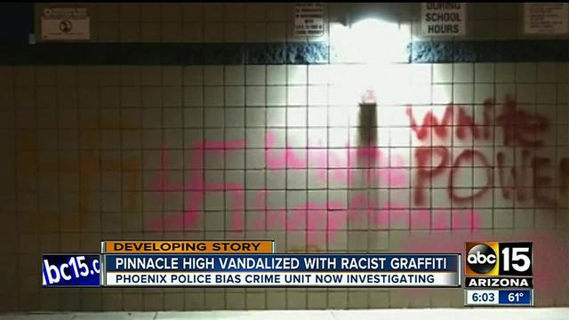 PHOENIX, AZ - Pinnacle High School was vandalized overnight with insensitive and racist phrases such as "white supremacy," "white power" and swastika symbols. Other graphic symbols were also spray painted onto various school walls and pillars.