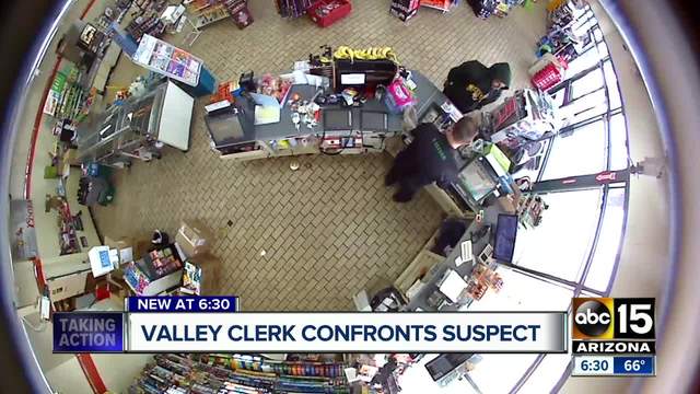 Surveillance video from inside the store shows the clerk grab a gun and chase the suspect outside.
