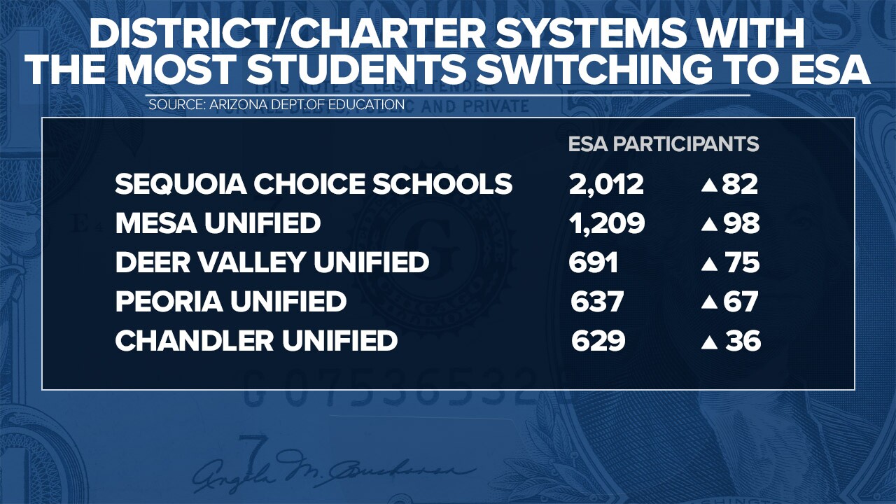The next four public school systems with the largest ESA enrollees are all large, suburban unified districts: Mesa, Deer Valley, Peoria, and Chandler Unified School Districts.