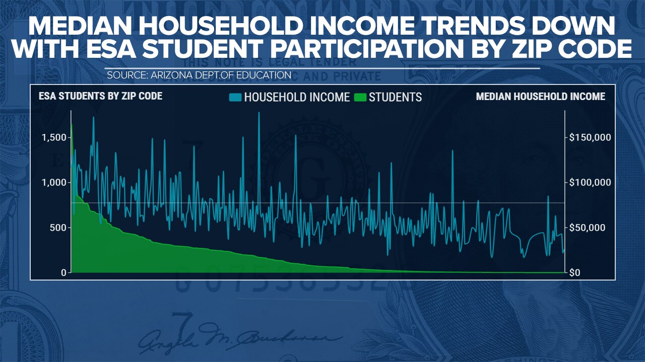 When zip codes are sorted by highest to lowest ESA enrollee population, a trend emerges in which nearly all zip codes with the greatest number of enrollees all have median incomes over $74,000, while most zip codes with the least number of enrollees are below that mark.