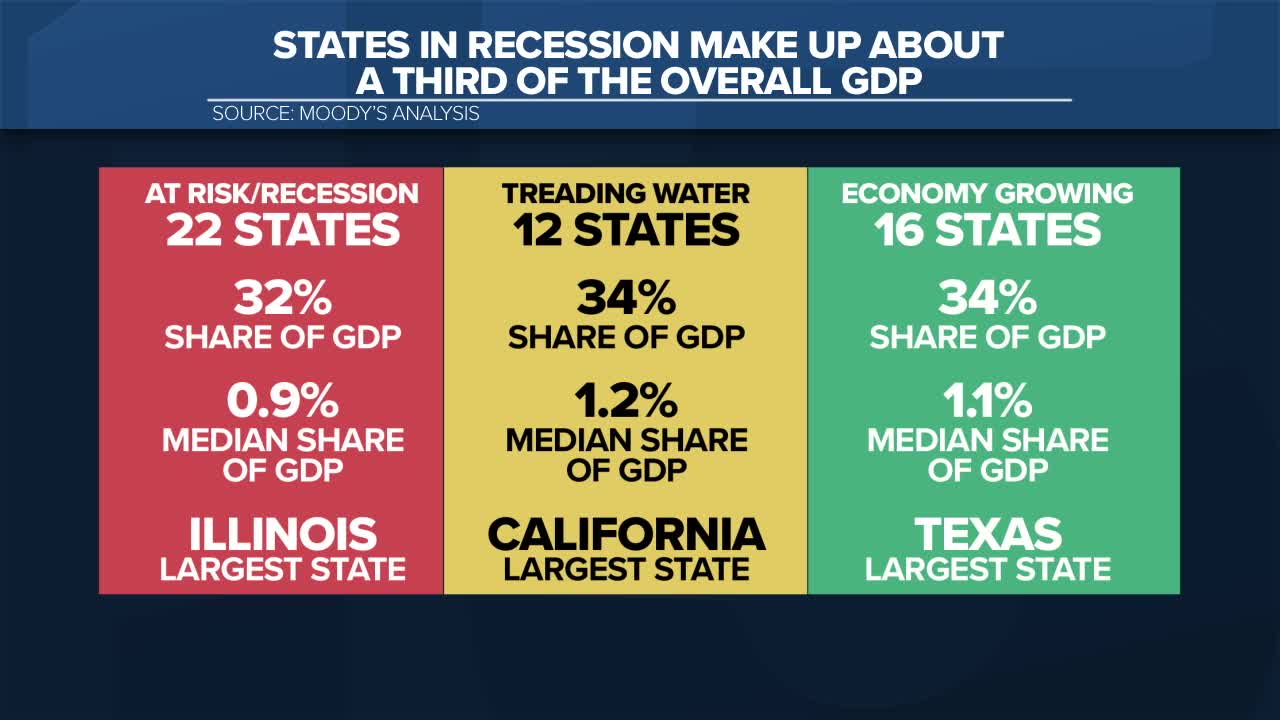 PHOENIX — A new analysis from Moody's Analytics reveals the United States economy is experiencing uneven growth patterns, with nearly half of all states either at risk of recession or already experiencing economic downturns.