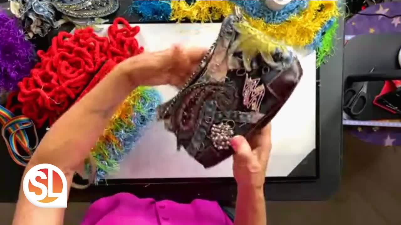 Craft Queen shows how she transforms handbags with colorful fabrics, decorative details, and jewelry