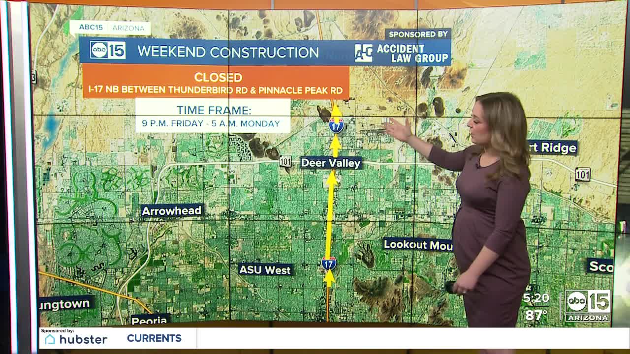 - Northbound Interstate 17 closed between Thunderbird and Pinnacle Peak roads from 9 p.m. Friday to 5 a.m. Monday (Sept. 11) for pavement improvement project. Both Loop 101 ramps to northbound I-17 closed. Northbound I-17 on-ramps at Dunlap Avenue, Peoria Avenue and Cactus Road also closed.