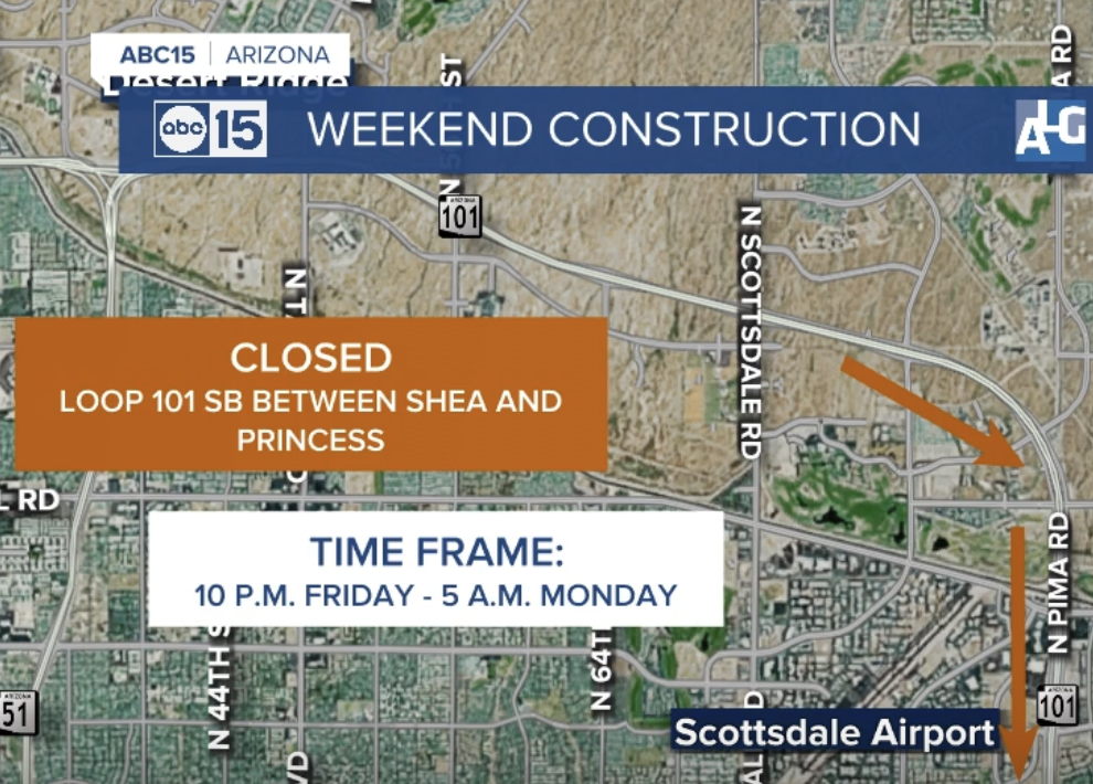 - Southbound Loop 101 (Pima Freeway) closed between Princess Drive/Pima Road and Shea Boulevard in Scottsdale from 10 p.m. Friday to 5 a.m. Monday (Oct. 6) for widening project. Eastbound Loop 101 on-ramps at Scottsdale and Hayden roads also closed.