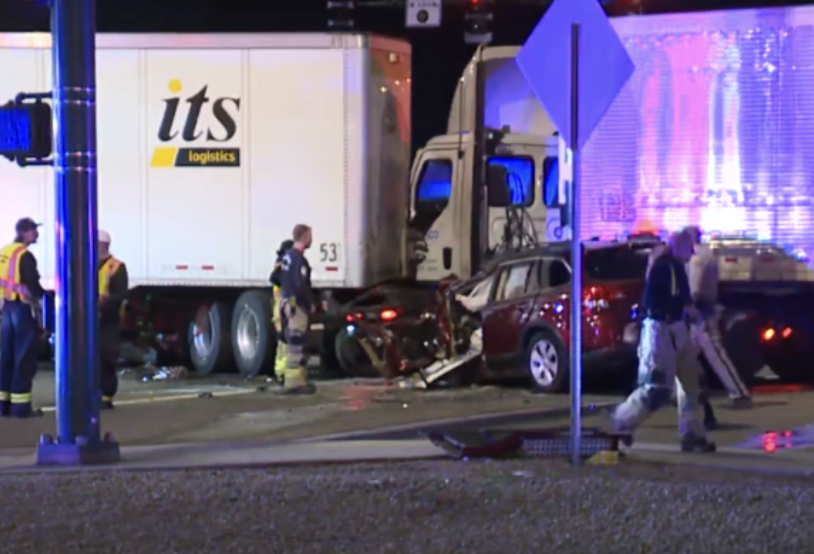Video from the scene near 75th Avenue and Van Buren Street showed a passenger car that was seriously damaged after a crash involving two semi-trucks.