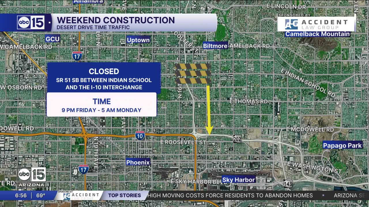 - Southbound State Route 51 closed between Indian School Road and Interstate 10 (Mini-Stack Interchange) from 9 p.m. Friday to 5 a.m. Monday (April 13) for surface asphalt removal as part of a pavement improvement project. Southbound SR 51 on-ramps at Glendale Avenue, Bethany Home Road and Highland Avenue also closed. Westbound I-10 HOV ramp to northbound SR 51 closed.