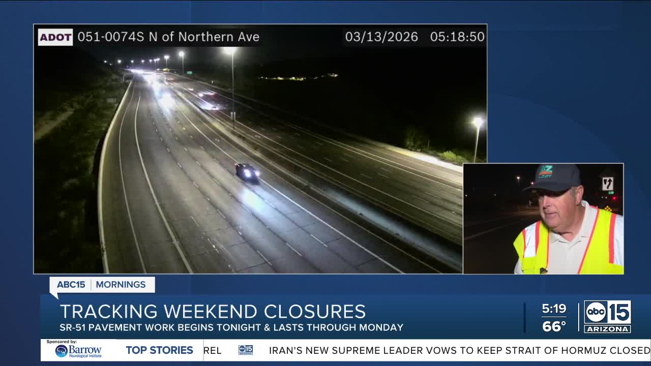 - Southbound State Route 51 closed between Cactus Road and Northern Avenue from 9 p.m. Friday to 5 a.m. Monday (March 16) for start of pavement improvement project. Southbound SR 51 on-ramps at Bell, Greenway and Thunderbird roads also closed.