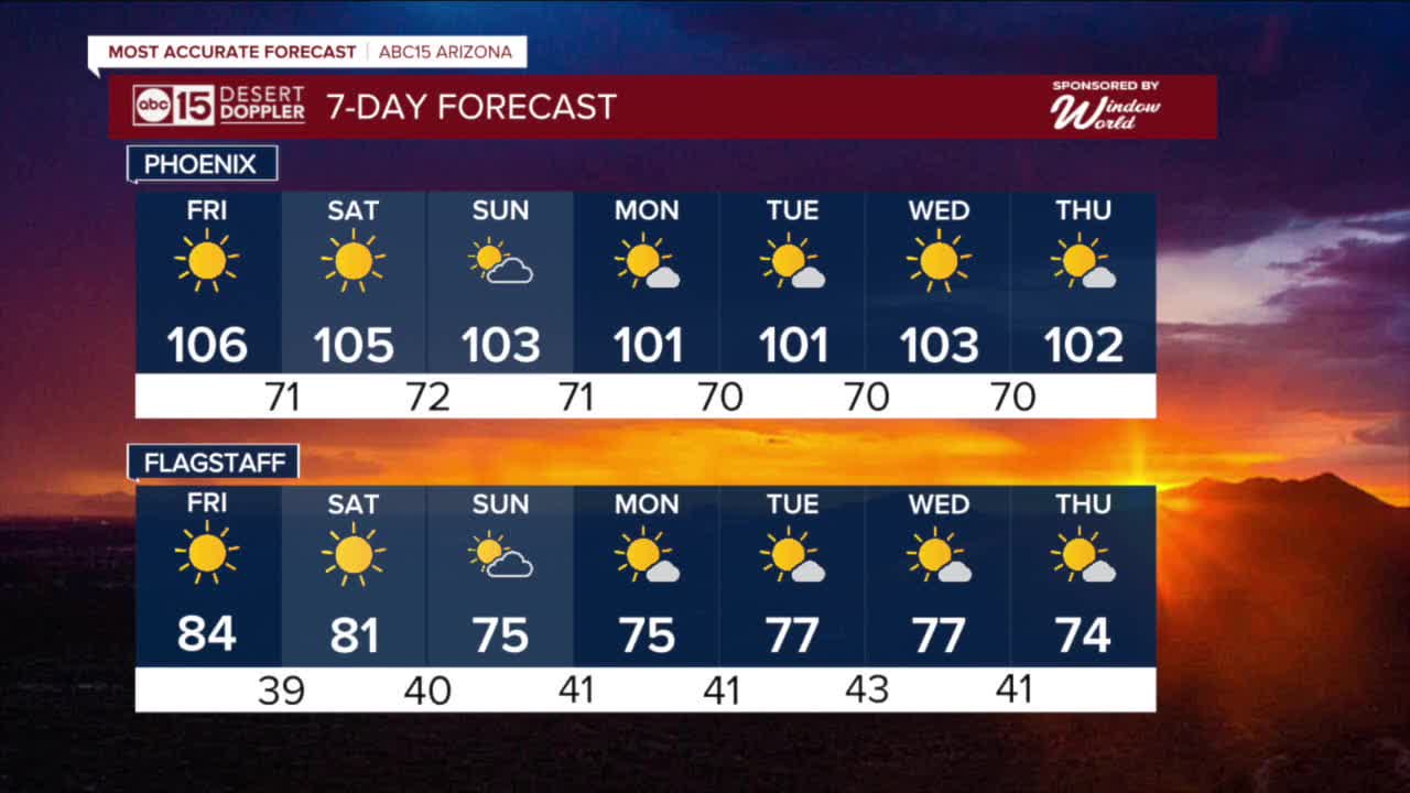 The peak of the heat dome lasts through Saturday, with highs between 105 and 106 degrees. Temperatures ease back into the low 100s next week, still well above normal for late March.