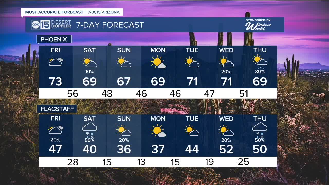 Looking ahead to Friday, the low-pressure system off the California coast will track north of Arizona late in the day. This will increase our cloud coverage through the day, with Valley highs remaining in the mid to lower 70s.