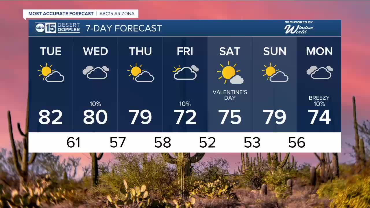 Temperatures will drop a few degrees on Tuesday as clouds move in late in the day. Look for highs in the low 80s across the Phoenix metro area, which is still ten degrees above average for early February.