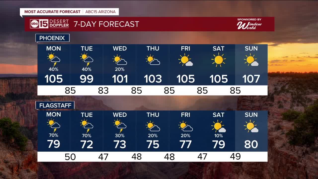 An Extreme Heat Warning remains in effect through 8 p.m. Sunday. After that, temperatures are expected to drop as monsoon moisture surges and storm chances increase heading into the workweek.
