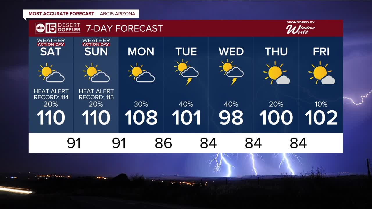 Phoenix will likely top out around 110 degrees over the weekend with overnight lows in the 90s.
