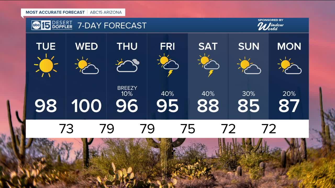 Today and Wednesday will stay mostly dry and warm, with highs well into the 90s across the Valley. Some spots in Phoenix could even reach 100 degrees by midweek.