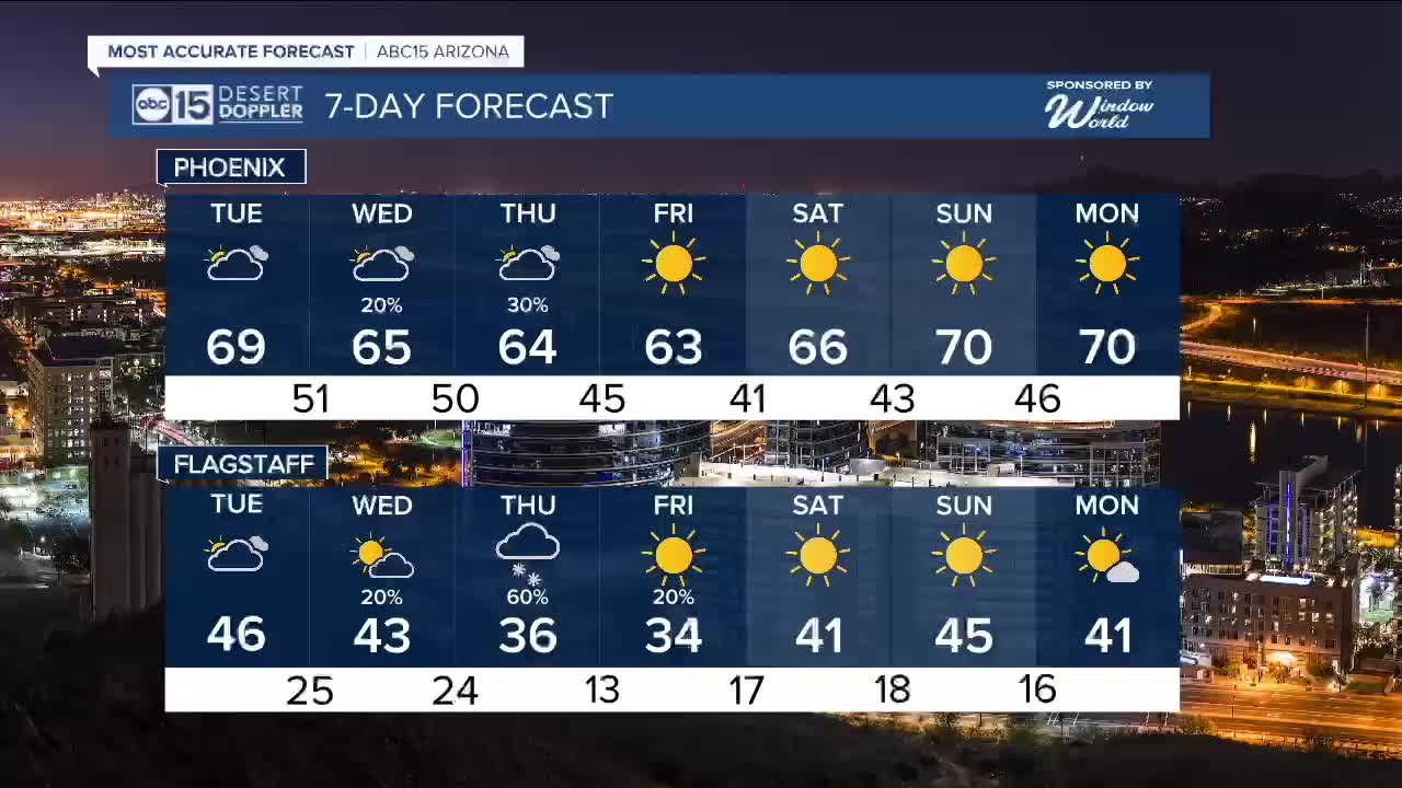 The first system is expected to stay south of Arizona, which would keep rain chances over southern and southeastern parts of the state. If it moves farther north, the Valley would have a better chance to see some rain.