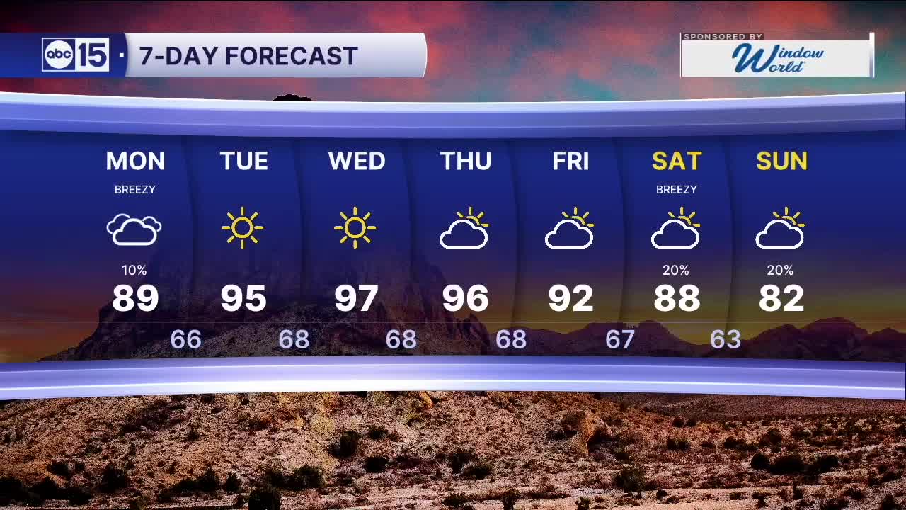PHOENIX — After a warm weekend with highs in the 90s, a weak storm system moves across Arizona Monday, bringing cloudy skies, spotty showers, and breezy conditions.