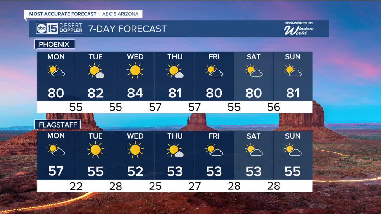 Phoenix could come close to another record on Monday and Thursday. The record high Monday is 82 degrees, set just last year, and we’re forecasting a high near 80.