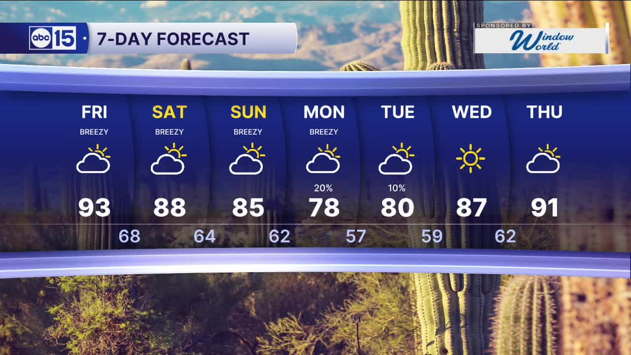 The first storm system will clip by this weekend, bringing more clouds, cooler air and a chance of spotty showers to parts of Arizona.