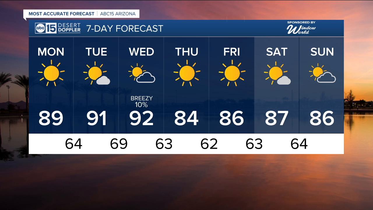 The warm-up sticks around through Wednesday, then a weak storm system moves across the state, bringing slight rain chances and some breezes throughout Arizona.